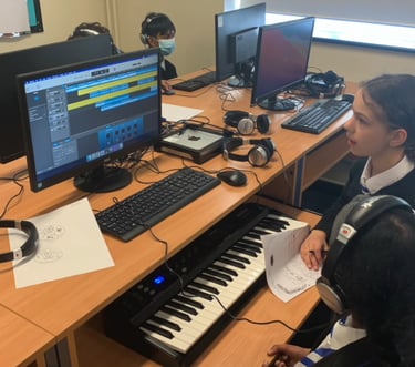 Secondary-focused immersive music songwriting/production activities. Work collaboratively to build a song from the ground up - arrangement, lyrics, recording and production, resulting in a pro-sounding mix of a finished song.